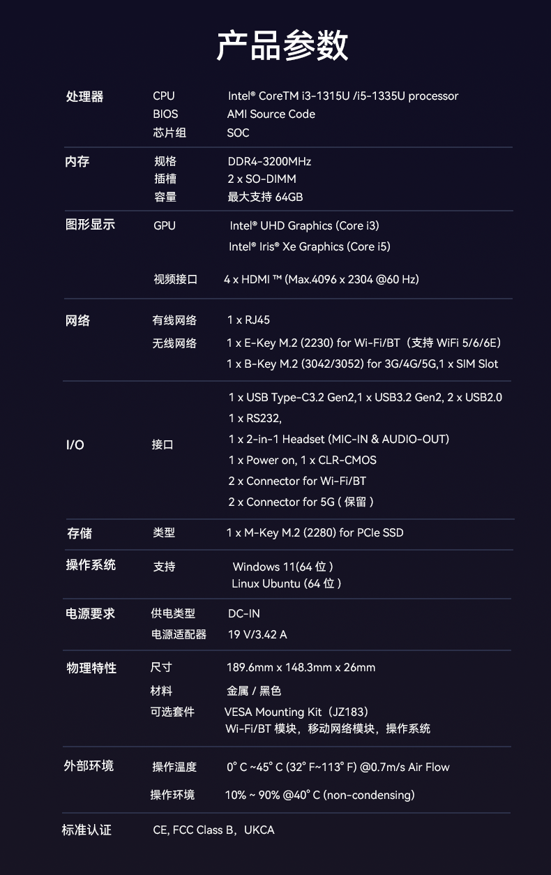 杰和科技D613采用英特爾Raptor Lake酷睿i3-1315U/i5-1335U 處理器,作為一款性能強悍的主機,它的TDP僅15W,能有效降低能耗,延長電池壽命。在內(nèi)存方面,D613采用2 x SO-DIMM DDR4-3200 MHz,最大可達64GB,并配備1 x M-Key M.2 (2280) for PCIe SSD。