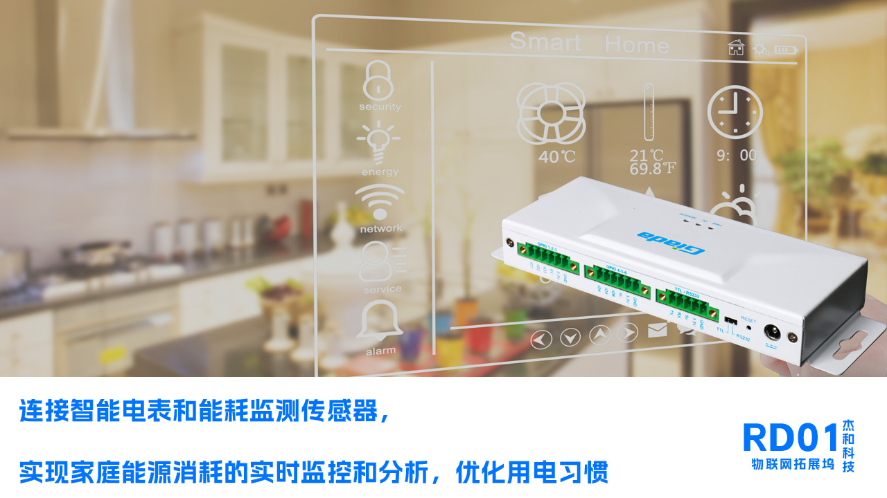 RD01連接智能電表和能耗監測傳感器,實現家庭能源消耗的實時監控和分析,優化用電習慣,整合門禁傳感器、窗戶傳感器和運動探測器,一旦檢測到異常行為,立即觸發警報并通知用戶。