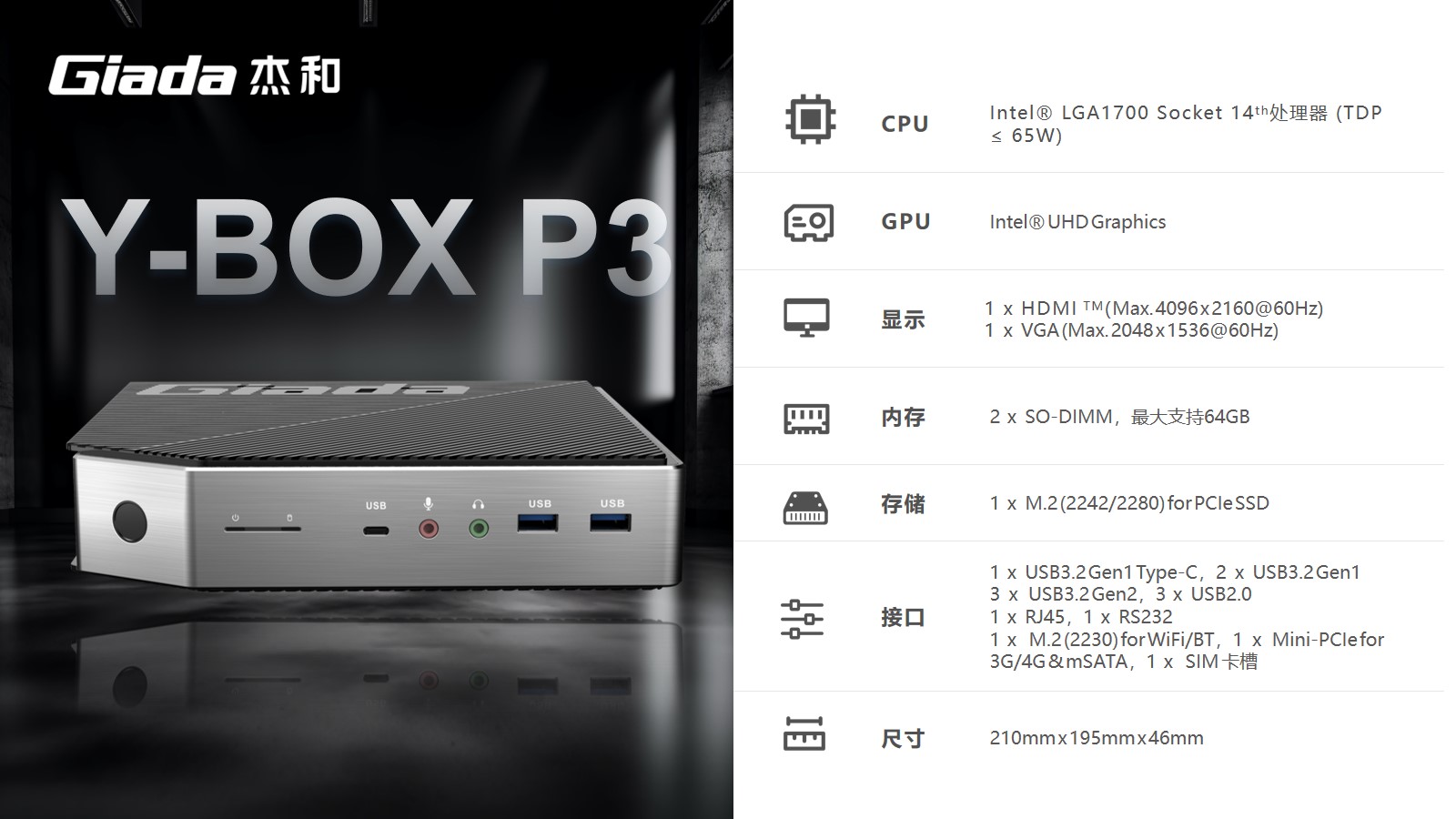 支持指紋解鎖,支持type-c接口,支持PD協議的27W快充。杰和科技最新云終端Y-BOX P3采用Intel® LGA 1700 Socket CPU插槽設計,支持intel 12~14代酷睿系列處理器,配備i7-14700處理器,20核28線程,最大睿頻頻率為5.4GHz,處理器基礎功耗 65W。采用雙通道筆記本內存槽設計,最大支持容量可達64GB,最高支持DDR5-5600MHz頻率,比 DDR4 至高標準數據速度 3200MT/S多傳輸 1.75 倍。