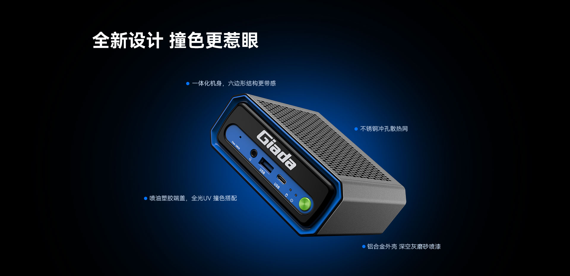 N601不同于傳統工業風設計,炫酷的一體化機身,頂面為不銹鋼沖孔散熱網,正面是六邊形結構,全光UV 撞色搭配,噴油塑膠端蓋,鋁合金外殼,美感與功能兼具。