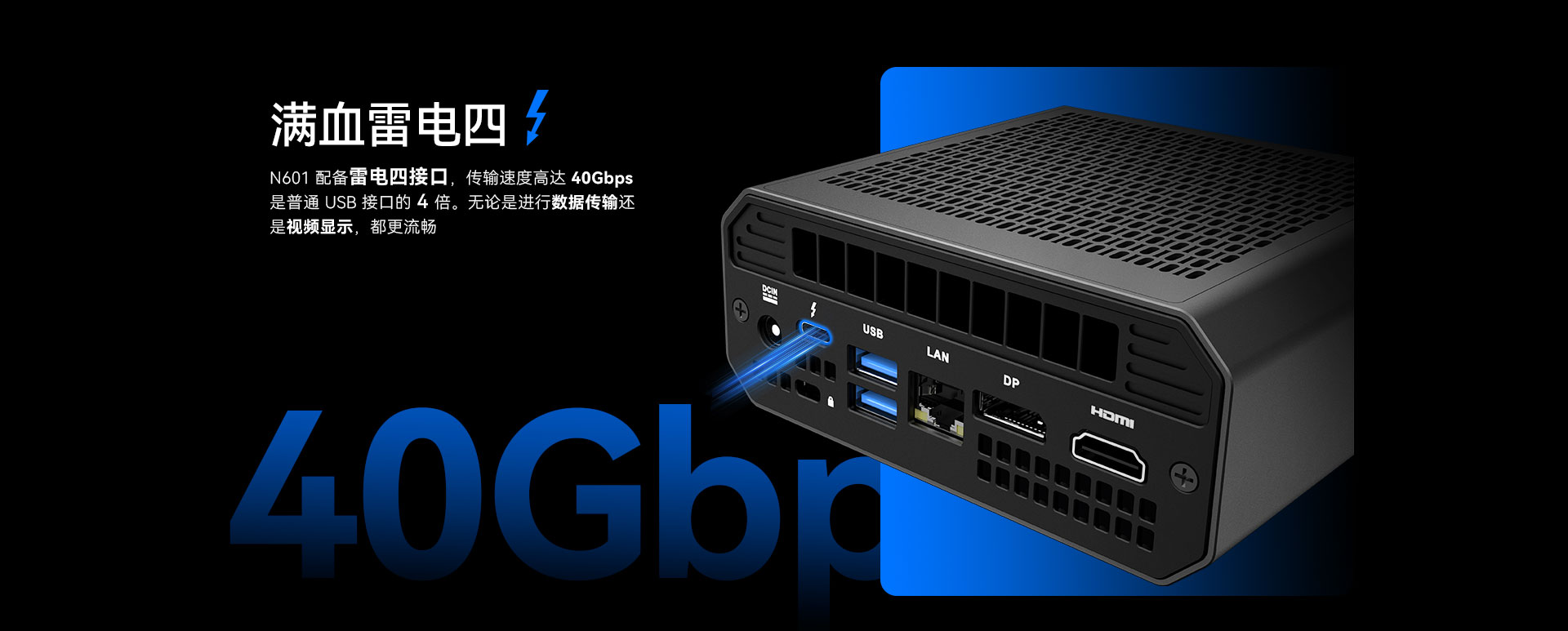 杰和科技N601配備雷電四接口,傳輸速度高達40Gbps,用戶可通過該接口連接2塊屏幕。還可通過HDMI2.1接口,DP1.4接口再連接兩塊屏幕,實現四屏異顯。雷電四還可以連接外設,如鼠標、鍵盤、控制器和耳機等。