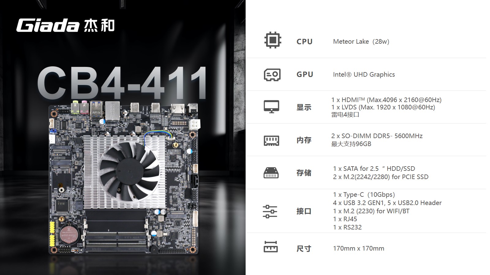 基于人們日漸新增的AI算力需求,杰和科技推出AI一體機專用主板——CB4-411。該主板設計緊湊,尺寸僅為170mm x 170mm。