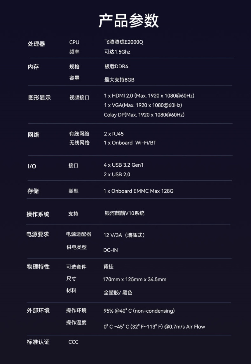 杰和科技云終端VT32搭載了飛騰騰瓏E2000Q處理器和其他國產(chǎn)組件,E2000Q集成2個FTC664和2個FTC310處理器核,主頻達1.5GHz,功耗最大僅11W;