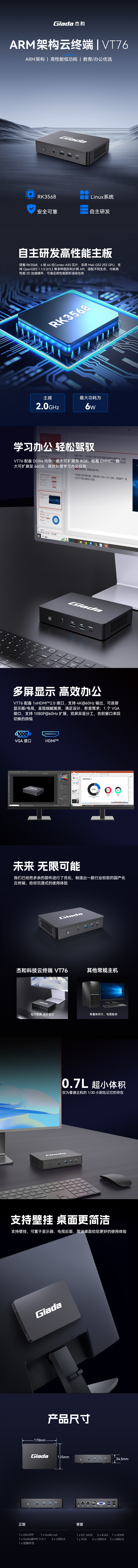 杰和科技ARM云終端——VT76,搭載瑞芯微RK3576 4核64位處理器,2.0GHz主頻,6W功耗。