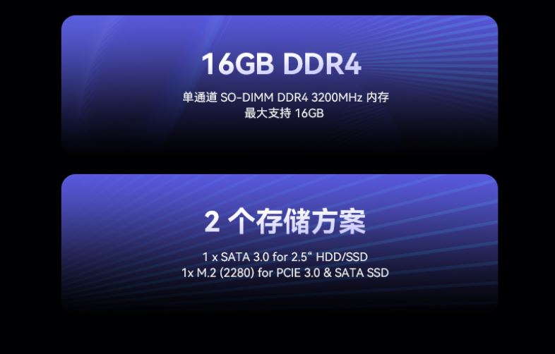 單通道DDR4 3200MHz,內存最大支持16GB,開機秒啟、多任務切換行云流水,告別卡頓等待;雙硬盤位設計,支持SSD與HDD混合存儲方案,兼顧大容量與高速讀寫。