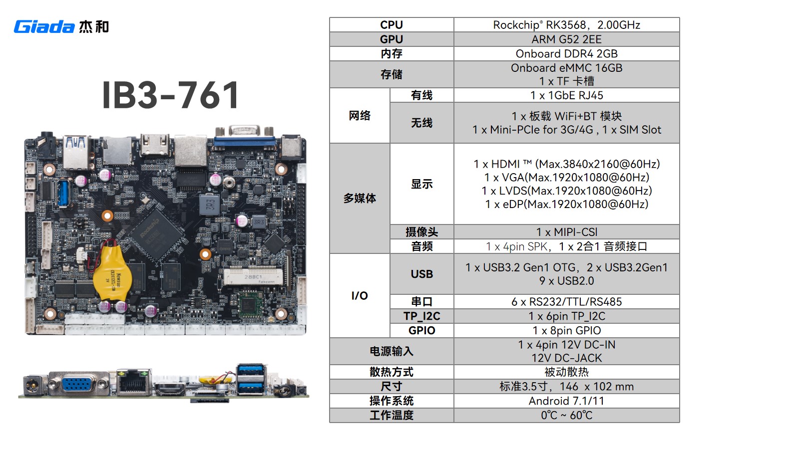 若側重基礎監控、車牌識別與多屏信息展示,IB3-761又是一個新的選擇,可在保證性能的同時優化項目成本。它搭載了RK3568處理器,1TOPS NPU 與雙路4K顯示能力,支持4K@60fps H.265/ H.264/ VP9/ VP8視頻解碼,在停車場智能化改造與道路監控中表現突出。