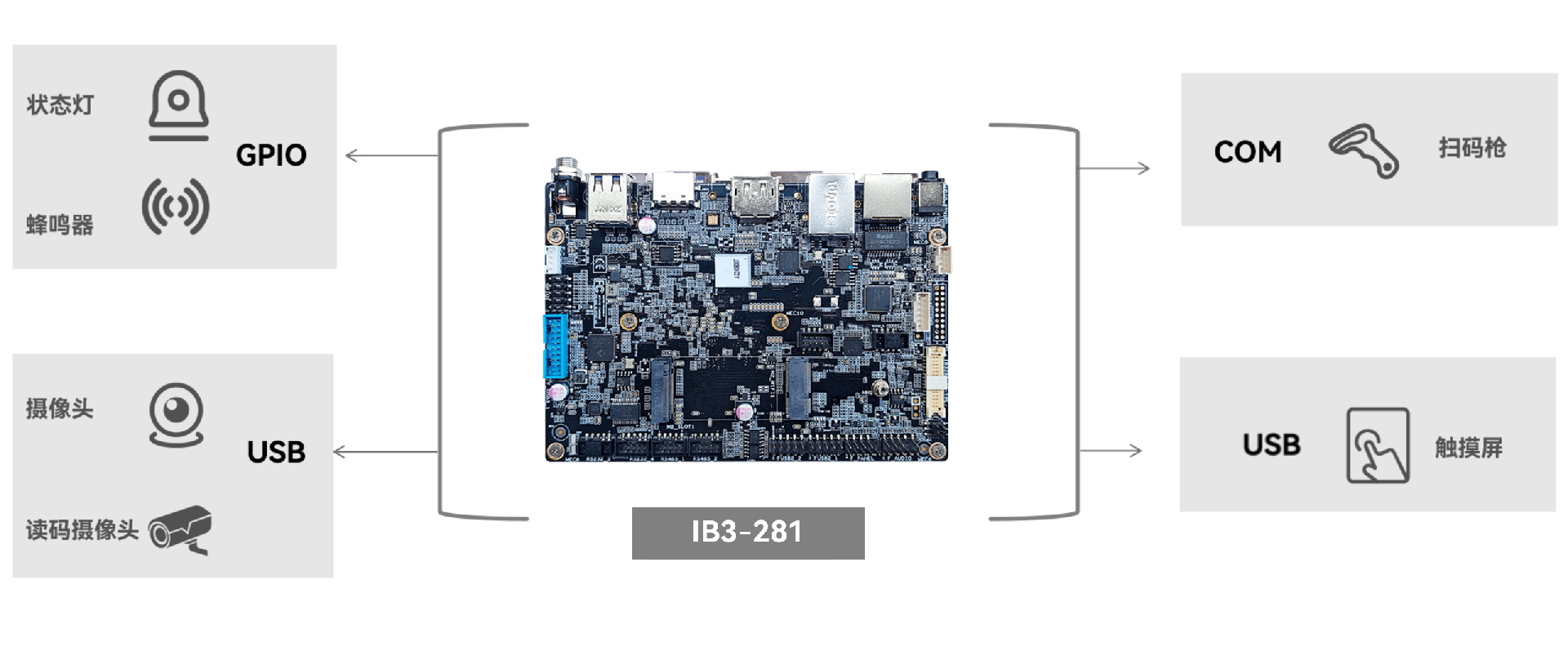 以典型的分揀工作站為例,其流程涵蓋掃描稱重、自動分揀與末端劃包等多個環節。杰和IB3-281作為系統的大腦,通過連接掃碼槍、攝像頭、稱重器等設備,高效協調數據采集與指令執行,顯著減少人工干預,降低分揀差錯率。