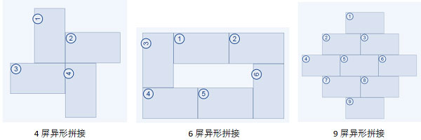 ● 支持多種拼接模式,顯示形式簡單自由拼接,可實現多種形狀組合的多屏異形拼接,如下圖: