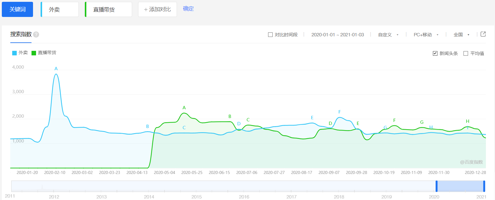 根據實時更新的百度指數可以看到,自2020年2月起“外賣”的百度綜合指數達到了均值30%以上的增長;而“直播帶貨”的百度指數從2020年4月20日空降全網,瞬間形成了現象級的全新零售營銷模式,“直播”從小眾文化走進大眾視野,第一次擁有了廣泛的變現渠道。此外,眾多諸如線上課堂、遠程會議、智能試衣鏡、線上個性化產品定制、無接觸配送等新概念產品,都因為疫情的因素加速鋪開速度,并迅速孵化出完善的產業鏈條。
