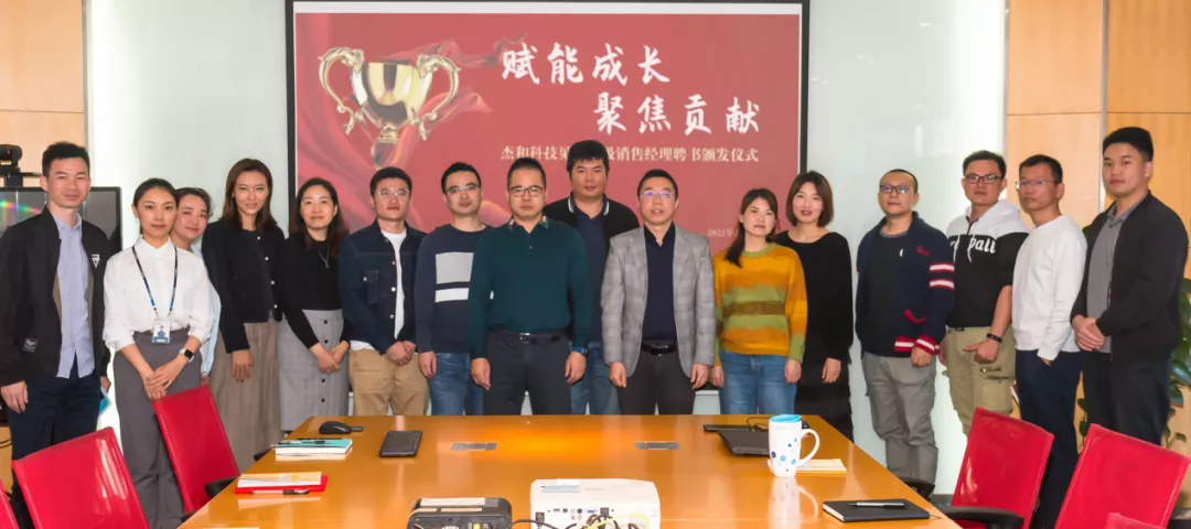 2021年2月22日,杰和科技公司舉行了國際銷售中心見習高級銷售經理聘書頒發儀式。期望三位同事能好好把握公司提供的職業發展平臺,把握公司給予他們量身定做的賦能成長機會,努力提升管理技能,帶領團隊做出貢獻。