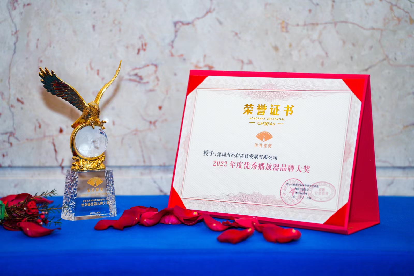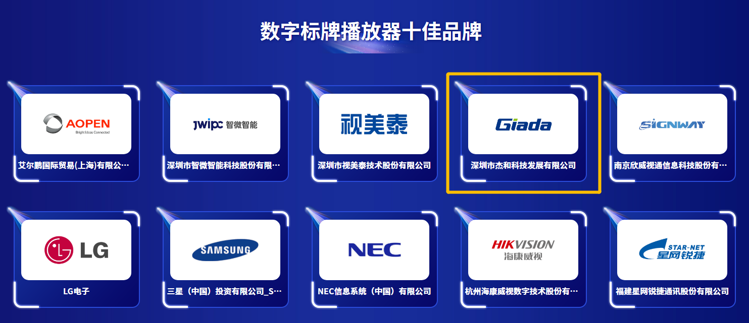 Giada杰和科技憑借突出的市場競爭力、強勁的產品創新力、卓越的產品成長力、領先的品牌影響力,從眾多候選企業中脫穎而出,斬獲“優秀多媒體信息發布系統品牌大獎”、“優秀播放器品牌大獎”兩項榮譽。Giada杰和科技已連續四年登上領獎臺。