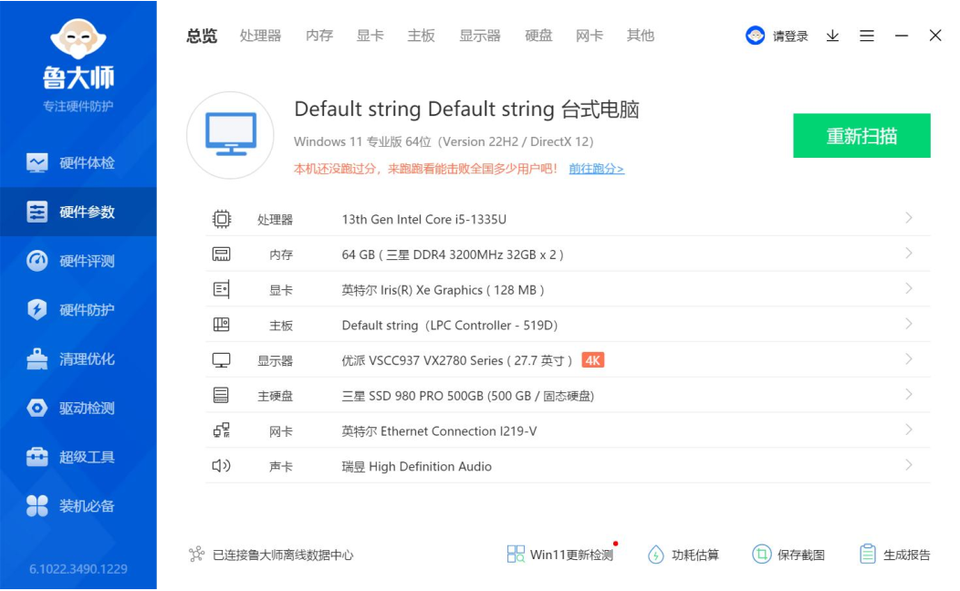 上面是魯大師識別的杰和AE613硬件參數詳情,我們進行跑分測試的核心三大件選擇的是13th Gen Intel(R) Core(TM) i5-1335U @1.30GHz處理器,Intel(R) Iris(R) Xe Graphics顯卡,三星 32GB*2 DDR4 3200MHz內存,三星SSD 980 PRO 500GB(500 GB/固志硬盤),下面我們來看詳細的跑分數據。