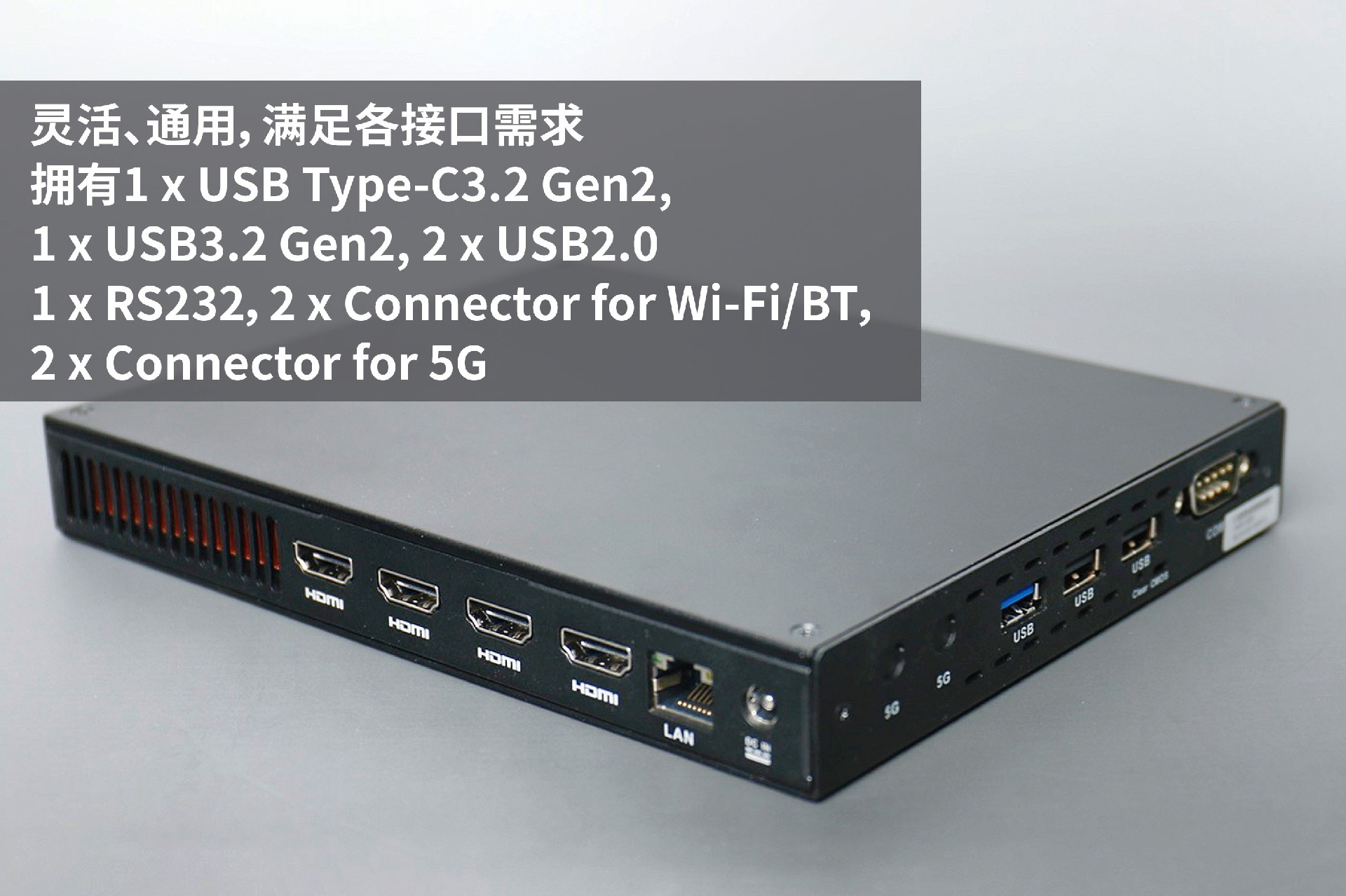 支持4 x HDMI 2.0接口,提供多達4屏4K顯示(4096 x 2304@60Hz);支持1 x RJ45千兆網口,1 x E-Key M.2 (2230) for Wi-Fi/BT, 支持Wi-Fi 5, Wi-Fi 6, Wi-Fi 6E (CNVi),具備強大的網絡通信能力。支持1 x USB Type-C3.1,1 x USB3.1 2 x USB2.0,1 x RS232,1 x二合一音頻接口,拓展能力豐富,可以連接會議大屏、攝像頭、麥克風、音響、U盤、擴展塢、無線投屏等設備。