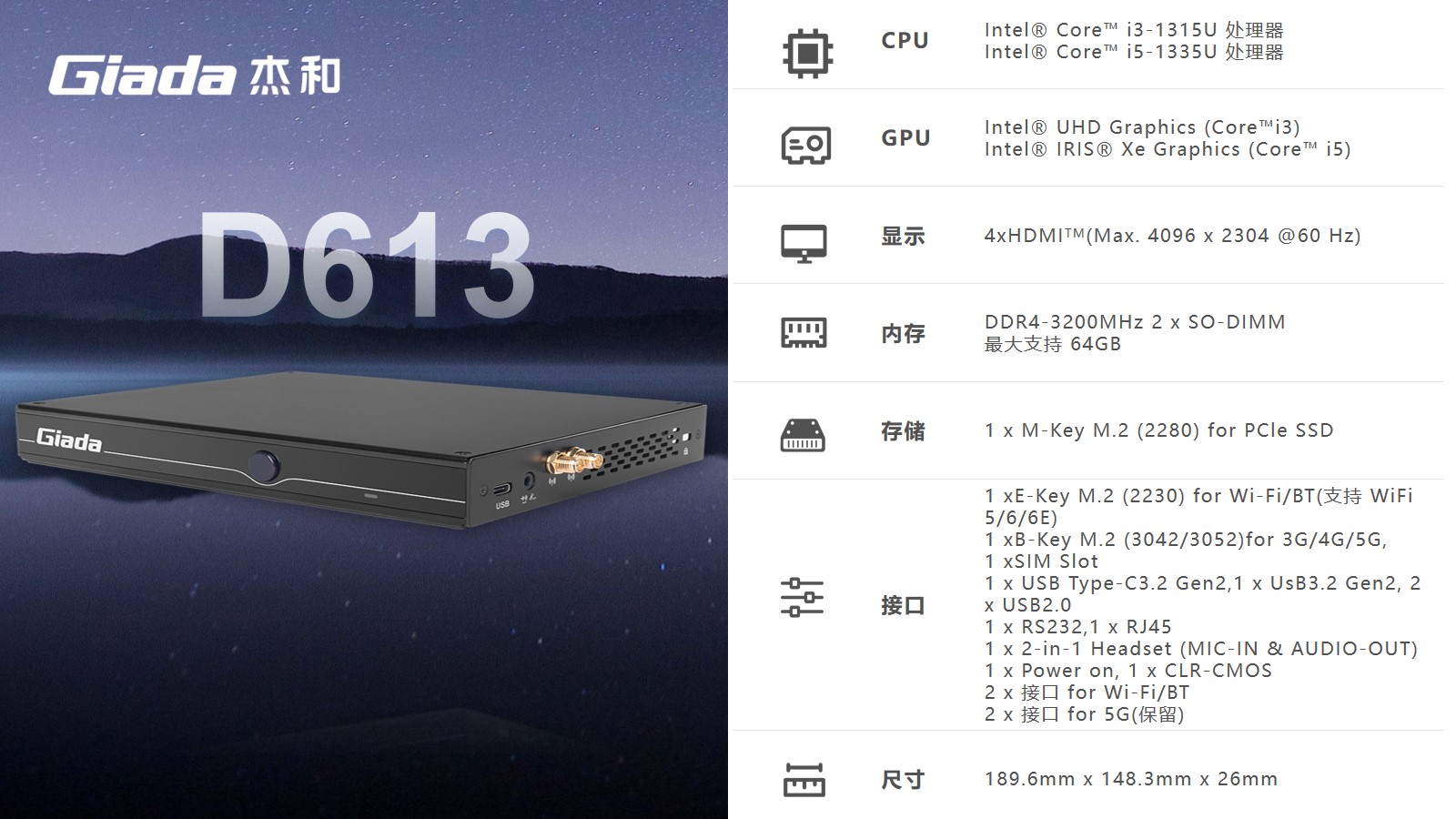杰和科技D613可選配Intel®第13代AlderLake i5-1335處理器,作為家用迷你主機來說,足夠大的內存容量也可以提升迷你主機的性能表現,更好地支持多任務處理,大型應用程序的運行以及高清視頻編輯等任務,擁有的2個SO-DIMM插槽,內存DDR4最大支持64GB的內存容量可以減少系統對硬盤的依賴,提高系統的響應速度。