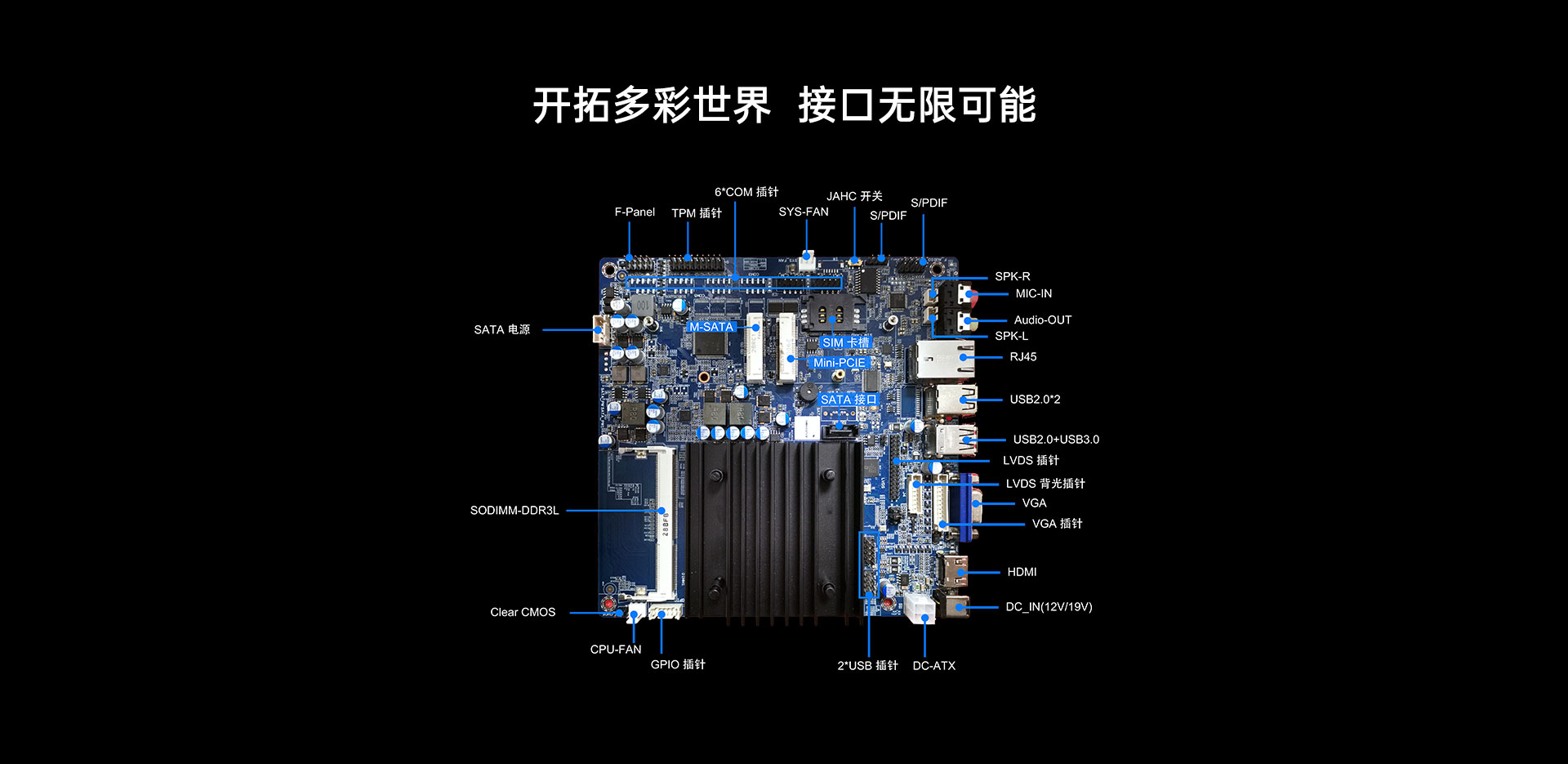 | 內部I/O | 接口 | 1x30pinLVDS(Max.1920x1080@60Hz) 2xUSB2.0插針(4個USB2.0) 1xMini-PCle擴展WiFi/BT/3G/4G 1xMini-PCle;擴展;mSATA 6x10pinCOM,1xSIM卡槽,1x4pinATX,1xSATA 1x4pinSPK,1x10pinF_AUDIO,1xGPIO |