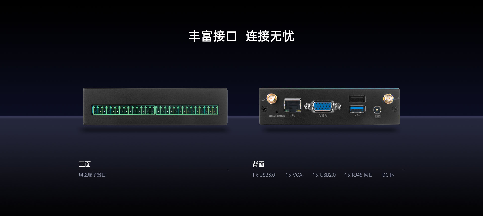| 鳳凰端口 | 共28pin端子,從左到右分別是TTL(3PIN)、I2C (4PIN) GPIO(1PIN)*2、USB(4PIN)、TTL(3PIN)*2、RS485/RS422/RS232(9PIN) | |